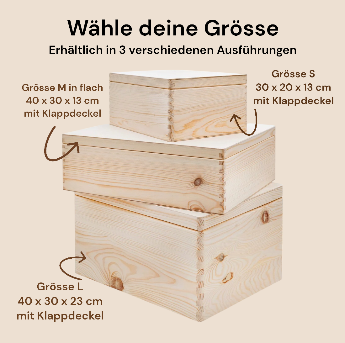 Unsere Grössen sind perfekt für die ersten kleinen Schätze deines Kindes. Egal ob das erste Armband aus dem Krankenhaus, süße Babysöckchen oder besondere Fotos – in dieser kompakten Box sind deine Erinnerungen sicher und stilvoll verstaut. Gefertigt aus hochwertigem, naturbelassenem Kiefernholz, mit einem stabilen Klappdeckel und abgerundeten Kanten, ist sie die ideale Wahl für eine liebevolle Aufbewahrung.