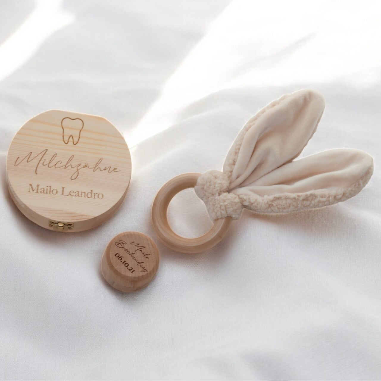 Diese liebevoll gestaltete Babyrassel vereint natürliche Materialien mit einem süßen, schlichten Design. Der glatte Holzring sorgt für ein angenehmes Greifgefühl und fördert die motorische Entwicklung deines Babys. Die weichen Hasenohren aus kuscheligem Baumwoll- und Plüschstoff laden zum Erkunden ein und bieten zusätzlichen sensorischen Reiz.