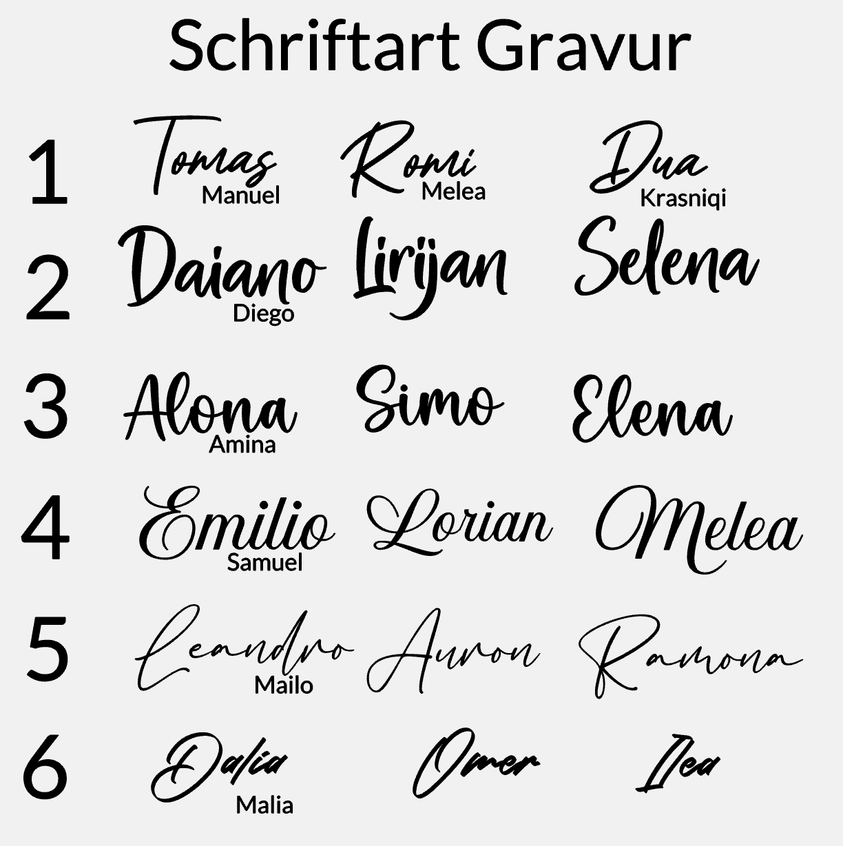 Material: naturbelassenes Holz, graviert und mit 3D-Namensschrift