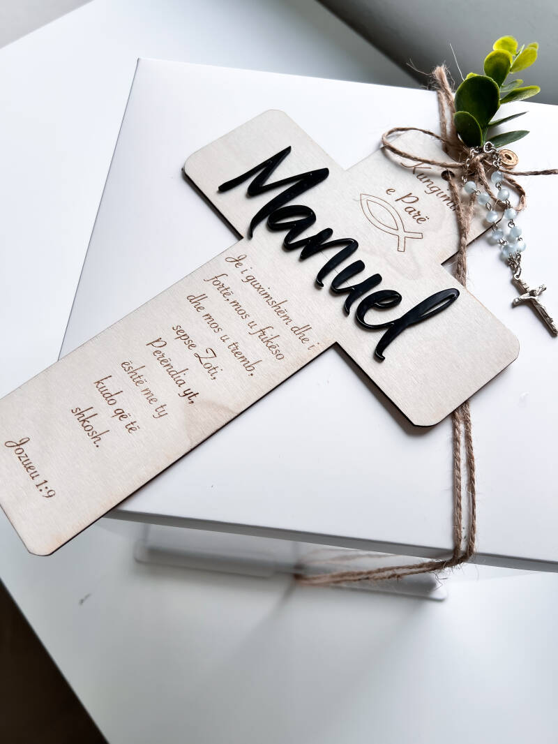 Dieses wunderschöne Holzkreuz mit Personailisirtem Namen ist ein besonderes Geschenk zur Taufe, Kommunion oder als liebevolles Erinnerungsstück. Gefertigt aus hochwertigem Holz, kombiniert es zarte Gravuren mit moderner 3D-Schrift, die dem Namen eine elegante Tiefe verleiht.