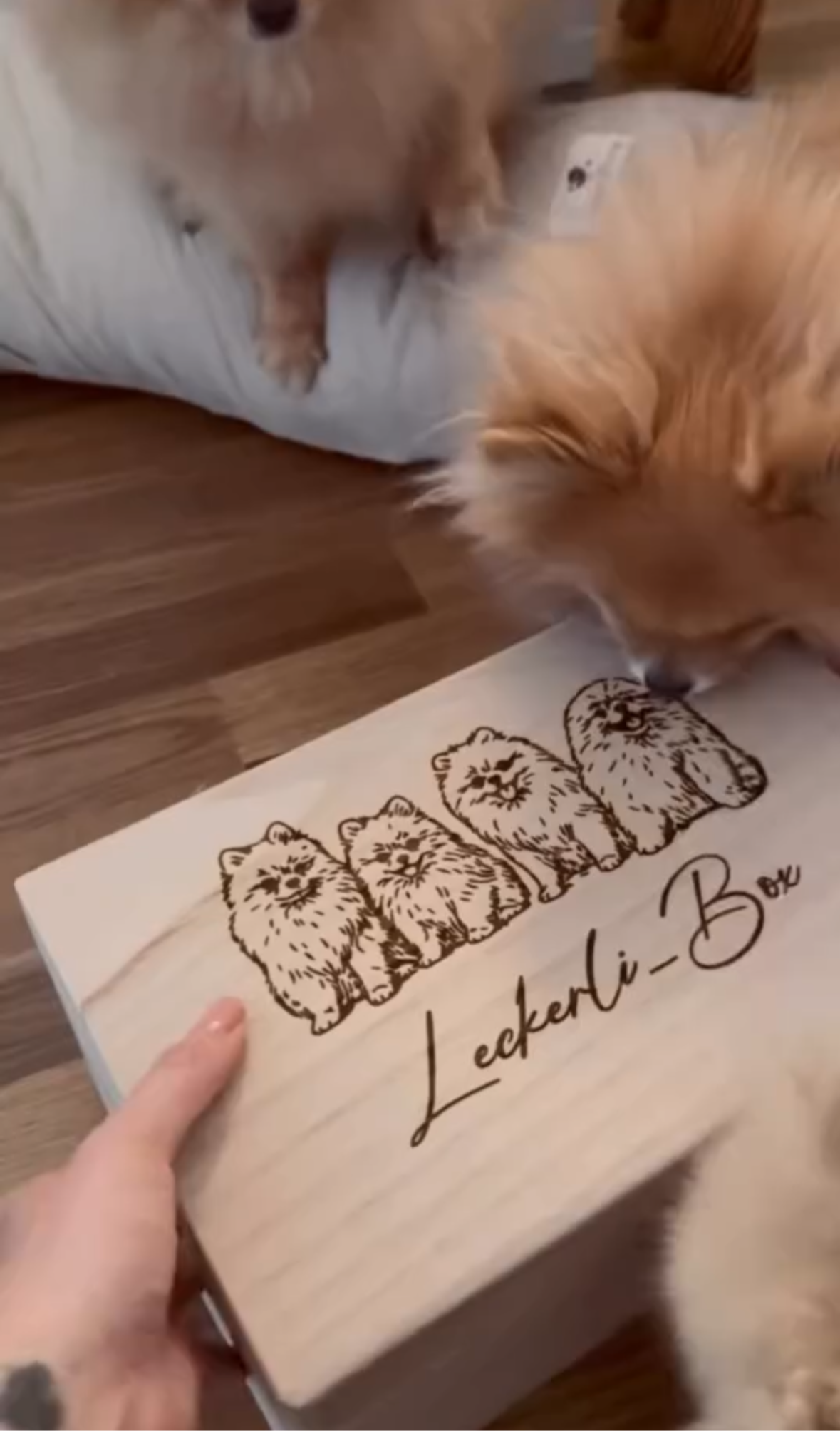 Das süße Detail auf dem Deckel – eine gravierte Illustration von kleinen Hunden sowie der Schriftzug „Leckerli-Box“ – macht sie zu einem echten Hingucker in jeder Hundehalter-Wohnung. Im Inneren rundet ein kleines Knochenmotiv im Deckel das liebevolle Design ab.