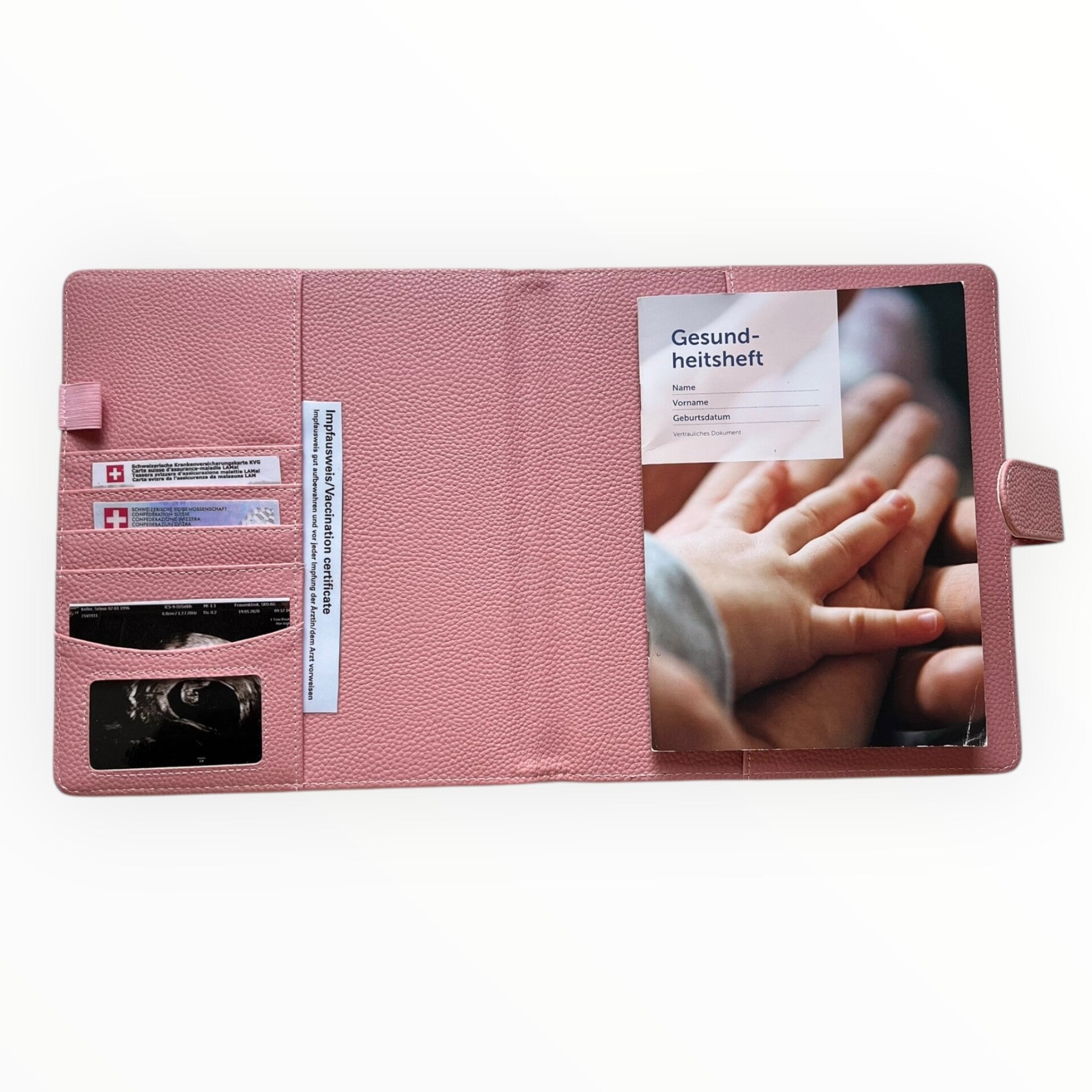Verstärkte Fächer für Gesundheitsheft, Impfpass, Ultraschallbilder & Karten.
