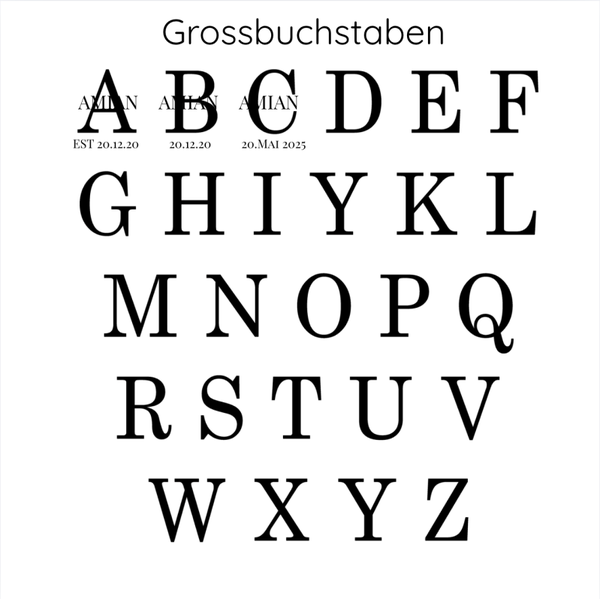 Schriftfarbe für Name & Datum – Großbuchstabe in Kontrastfarbe.