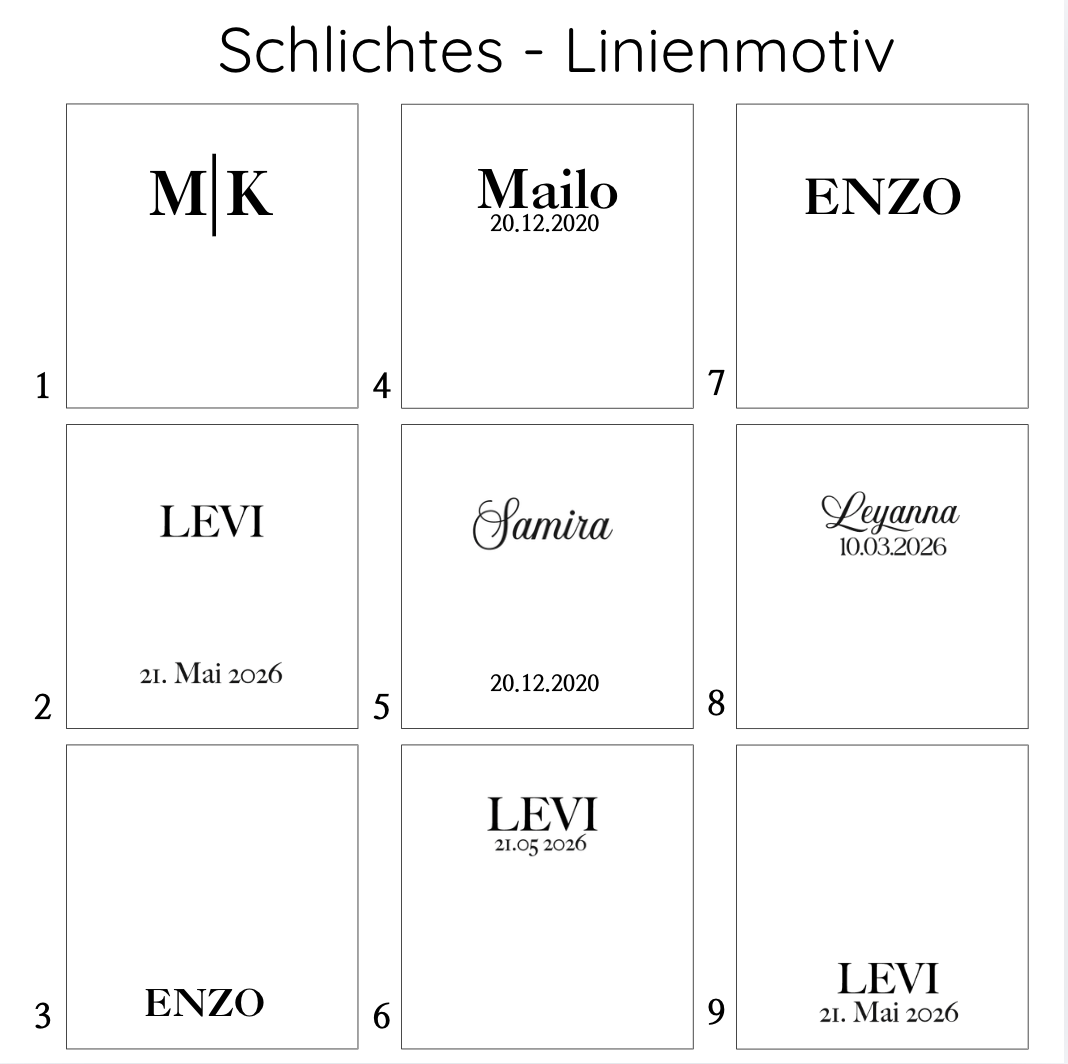 Wähle Name, Geburtsdatum, deine bevorzugte Schriftart und dein Lieblings-Motiv – für ein echtes Unikat.